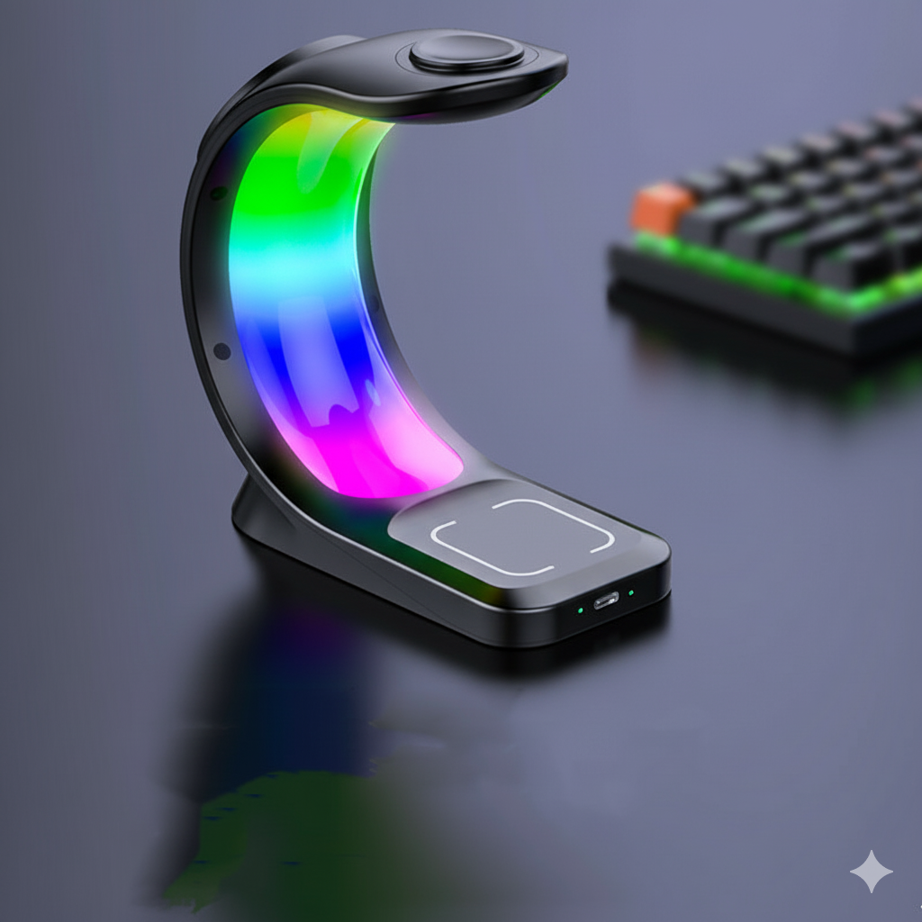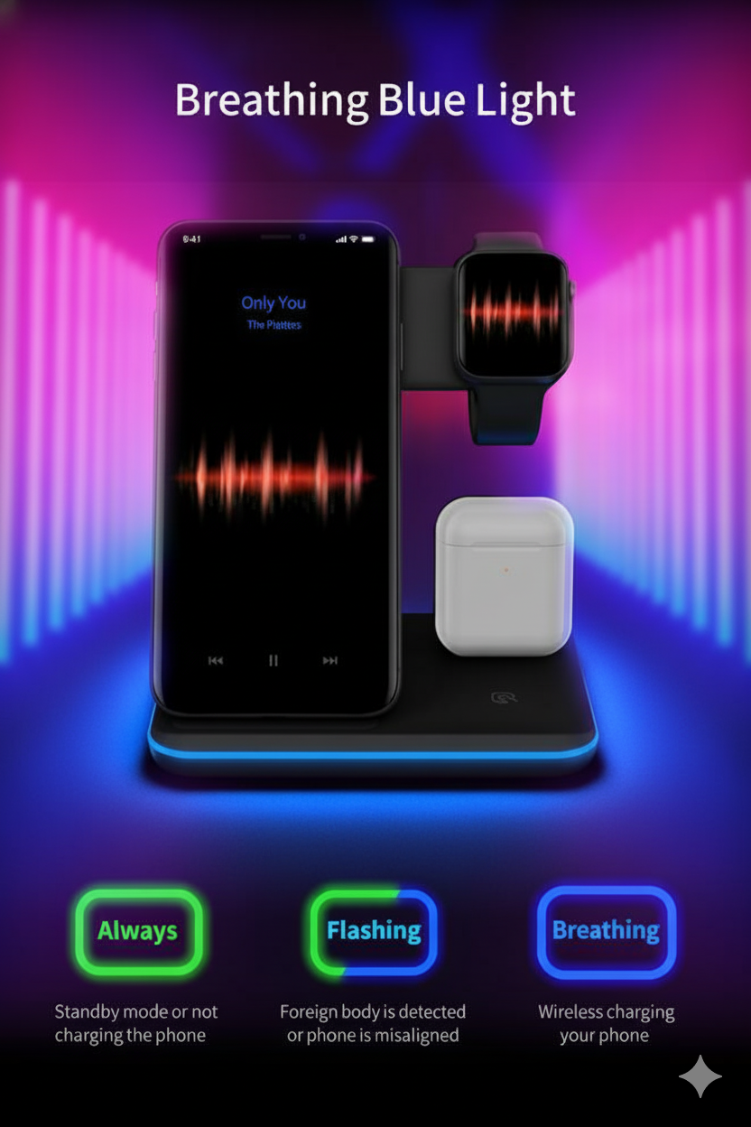 Charge phone, watch, earbuds overnight — neat, soft-lit bedside